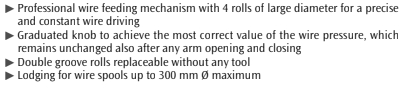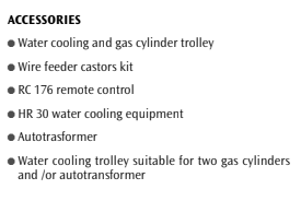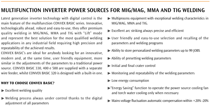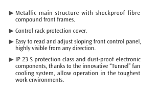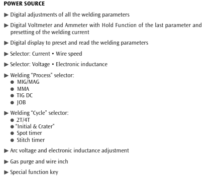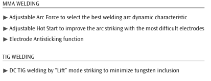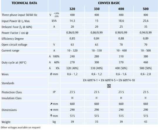 DETALHES- Three fase input 50/60 Hz - 400 V - Input power @ I2 max - 18,6 KVA - Delayed fuse (I2@60%) - 25A - Efficiency degree - 0,88 - Open circuit voltage - 70 A - Current range - 10 a 400 A - Duty cicle at 40ºC - 310 A a 100% / 400 A a 50% - Protection class - IP 23 S - Insulation class - H - Dimensions: 660 x 290 x 515 mm - Weight: 39 kg